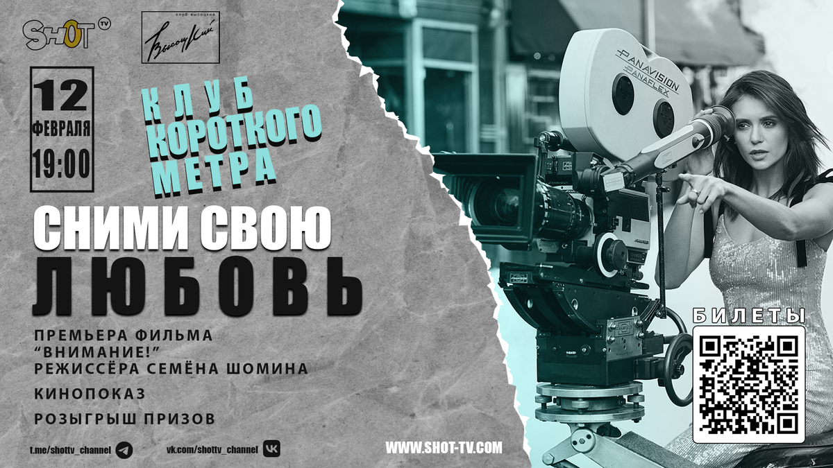 Реклама ООО «Клуб «Высоцкого», ИНН: 7709619837. erid: 2W5zFJrRTXW 12 февраля пройдет первая в 2025 году встреча Клуба короткого метра — «Сними свою любовь!» В ее рамках состоится премьера короткометражного фильма Семена Шомина «Внимание!» Семен Шомин — выпускник ГИТИСа (мастерская Л.Е. Хейфеца), актер московского театра «Современник». «Внимание!», снятое при участии артистов этого театра, — дебютная киноработа Семена. В программе вечера неформальное общение с актерами, режиссерами, продюсерами и представителями мира рекламы, розыгрыш призов и показ романтичных короткометражек с ведущих мировых фестивалей — от ромкома до трэша. В рамках Клуба продолжает работу Лаборатория короткого метра. В течение года, воспользовавшись специальной формой на сайте shot-tv.com, присылайте нам свои фильмы. В конце 2025-го, на финальной встрече Клуба, мы подведем итоги и назовем победителя, который получит специальный приз телеканала SHOT TV. Условия конкурса ЗДЕСЬ. Вступайте в наш Клуб и смотрите отл