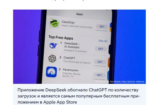 Информация, которую фирма DeepSeek предоставила о своей модели ИИ, пошатнула фундаментальные представления о разработке таких моделей и наглядно показала, что Китай все больше способен конкурировать с США в области искусственного интеллекта. DeepSeek является лидером в области ИИ в Китае, рассказала DW Анджела Чжан, профессор права в Университете Южной Калифорнии и автор книги о китайской технологической индустрии. Однако, по ее словам, "есть как минимум четыре китайские компании, которые утверждают, что разработали модели искусственного интеллекта, способные соперничать с американскими конкурентами из Кремниевой долины". "DeepSeek - не исключение, а, скорее, свидетельство развитости всей индустрии искусственного интеллекта в Китае", - говорит эксперт. Приложение DeepSeek обогнало ChatGPT по количеству загрузок и является самым популярным бесплатным приложением в Apple App Store Ричард Виндзор, технический аналитик и основатель британской исследовательской фирмы Radio Free Mobile, не с