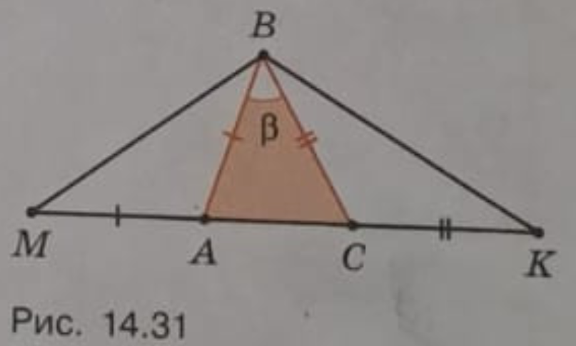 На продолжении стороны AC треугольника ABC отметили точки M и K так, что AM=AB, CK=BC. Найдите угол MBK, если угол ABC равен в (рис.14.31) Треугольник MAB и BCK равнобедренные, значит углы при основании равны, введем обозначение: Сумма углов в треугольнике MBK = 180 градусов Распишем: Мы нашли чему равняется х+у Что бы найти угол при вершине треугольника MBK, нужно из 180 вычесть углы при основании то есть х и у: