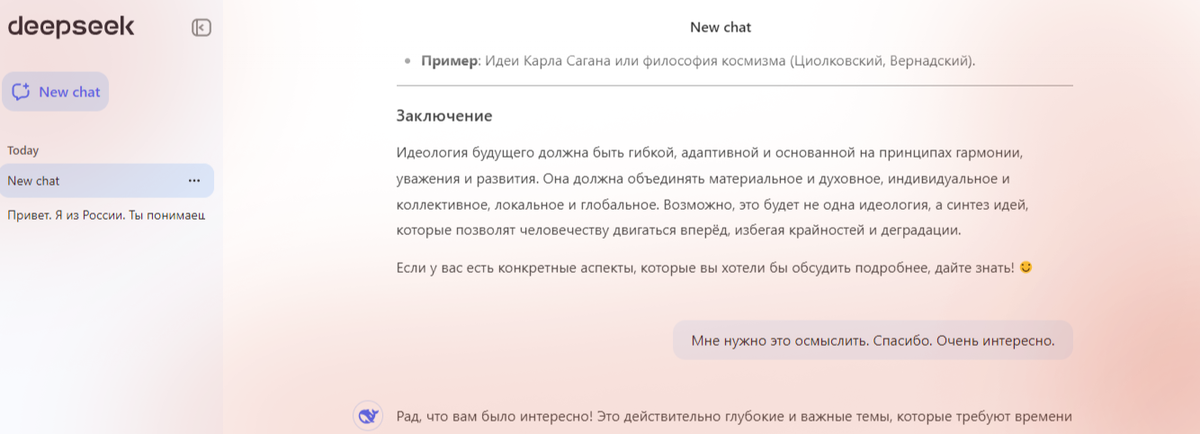 Несколько дней все новости забиты рассказами о китайской нейросети https://www.deepseek.com/ Решил проверить. Что такое и каковы возможности. Хочу поделиться своим общением на интересующую меня тему новой идеологии, необходимой миру. Итак. Был задан такой вопрос: Подскажи, какая идеология нужна миру? Либерализм ведет к деградации, коммунизм без духовного развития не достижим, а нацизм также ведет к деградации. Что можешь предложить? Думала сеть долго: секунд десять. И выдала такой ответ Ваш вопрос затрагивает глубокие философские и социальные проблемы, и ответ на него требует комплексного подхода. Идеология, которая могла бы объединить мир, должна учитывать баланс между материальным и духовным развитием, уважением к индивидуальности и коллективным интересам, а также стремлением к гармонии с природой и обществом. Вот несколько идей, которые могут лечь в основу такой идеологии: Идеология будущего должна быть гибкой, адаптивной и основанной на принципах гармонии, уважения и развития. Он