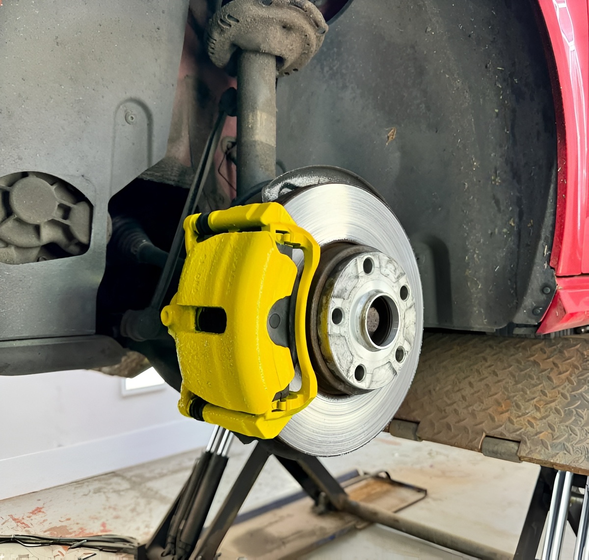 Если вы задумались над тем, чтобы освежить внешний вид тормозных суппортов на своём автомобиле, то эта статья для вас. Осуществить задачу не так сложно, как может показаться на первый взгляд. А как правильно это сделать и чем, расскажем далее. Прежде всего это придаёт или возвращает свежий и эстетичный облик не только им, но и в целом всему автомобилю. Во-вторых, покраска тормозных суппортов защищает от появления на них очагов коррозии, которые возникают при попадании воды, грязи или дорожных реагентов. Ещё один факт: чистые или свежо покрашенные тормозные суппорты остывают быстрее, тем самым это влияет на эффективность работы тормозной системы. 1. В первую очередь необходимо снять колесо, чтобы получить полный доступ к тормозному суппорту. Поэтому поднимаем автомобиль домкратом, откручиваем гайки, которыми крепится колесо, и снимаем его. 2. Подготовка поверхности к покраске – это важный и ответственный этап, от которого будет зависеть качество результата. Если на суппортах есть стара