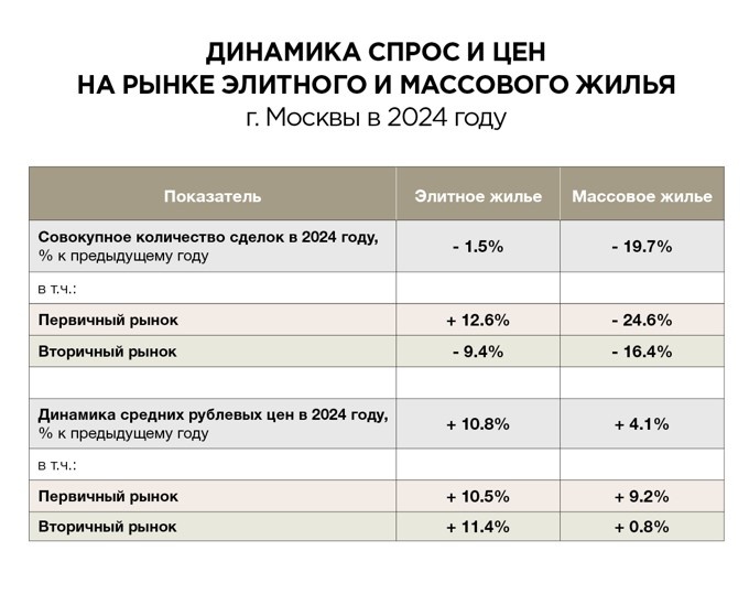 2024 год был непростым для московского рынка жилья. Спрос на квартиры оказался под давлением высокой ключевой ставки и отмены ипотеки с господдержкой. В этих условиях сегмент элитного жилья вновь показал себя более устойчивым, чем массовый рынок. И в части динамики спроса, и динамики средних цен. По итогам прошлого года элитный сегмент практически не потерял покупателей – совокупный спрос символически сократился всего на 1.5% к 2023 году (который был очень успешным). В массовом сегменте количество сделок за этот же период снизилось почти на 20%! Если смотреть только на сегмент новостроек, то в «элитке» число заключенных ДДУ за 2024 год увеличилось на 12.6%, в то время как на массовом рынке - сократилось на 24.6%. Более впечатляющим выглядит и ценовая динамика для высокобюджетных квадратных метров – прирост за год составил 10.8%. Причем сопоставимо подорожала и первичка, и вторичка. Для массового жилья совокупный рост составил около 4%. При этом вторичное типовое жилье за прошлый год п