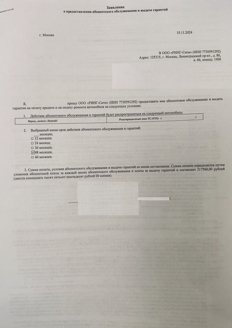 Рассказываем, как осуществить возврат данной гарантии на примере нашего клиента. Клиент обратился к нам за консультацией после оформления автокредита в АО "МС Банк Рус". В процессе работы с клиентом сотрудники банка навязали ему дополнительную услугу - продленную гарантию на оплату кредита и ремонта автомобиля на определенных условиях от ООО "РИНГ-сити" стоимостью 217 560 руб. Если вы оказались в такой же ситуации и решили отказаться от данной гарантии, необходимо предпринять следующие шаги: 1) Составить досудебную претензию и отправить ее по юридическому адресу исполнителя - ООО "РИНГ-сити" (ИНН 7730591292): 125315, г. Москва, вн. тер. г. муниципальный округ Сокол, пр-кт Ленинградский, д. 80, к. 66, помещ. 1406. 2) В случае отказа в возврате средств со стороны компании, составьте исковое заявление и передайте его в суд. Вы можете также рассчитывать на компенсацию морального вреда и дополнительное взыскание от компании штрафа в размере половины стоимости услуг. 3) Когда суд вынесет реш