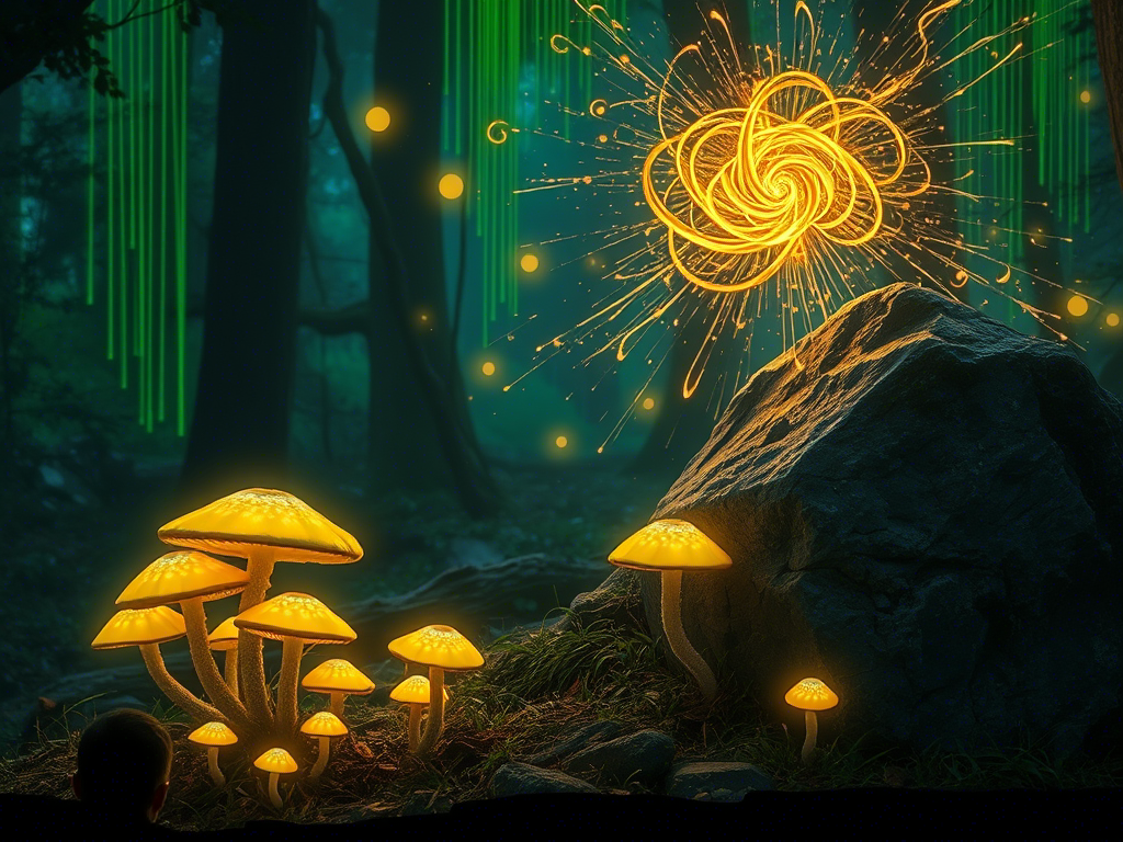 В глубине древнего леса, где тени сплетались с светом, а время текло как смола, бродил Элиас. Он пришел сюда, уставший от вопросов, на которые не находил ответов — о смерти сестры, о пустоте, что грызла его изнутри. Старый шаман племени Куна говорил: «Ищи грибы-побратимы у камня с лицом луны». Элиас не верил в духов, но верил в боль, которая привела его к замшелому валуну, где в трещинах угадывался лик ночного светила. Возле камня росли они. Не грибы, а существа: шляпки мерцали биолюминесцентной паутиной, ножки вибрировали в такт незримого барабана. Когда Элиас коснулся одного, лес взорвался цветами, которых не знал человеческий глаз. Звуки обрели форму — жужжание пчел стало золотыми спиралями, шепот листьев — зеленым дождем. «Мы — голос того, что под кожей мира», — пронеслось в нем, не словами, а вспышкой понимания. Грибы вели его сквозь слои реальности: он видел, как деревья дышат через века, как олени умирают, чтобы стать грибницей, как его собственная боль переплеталась с корнями д
