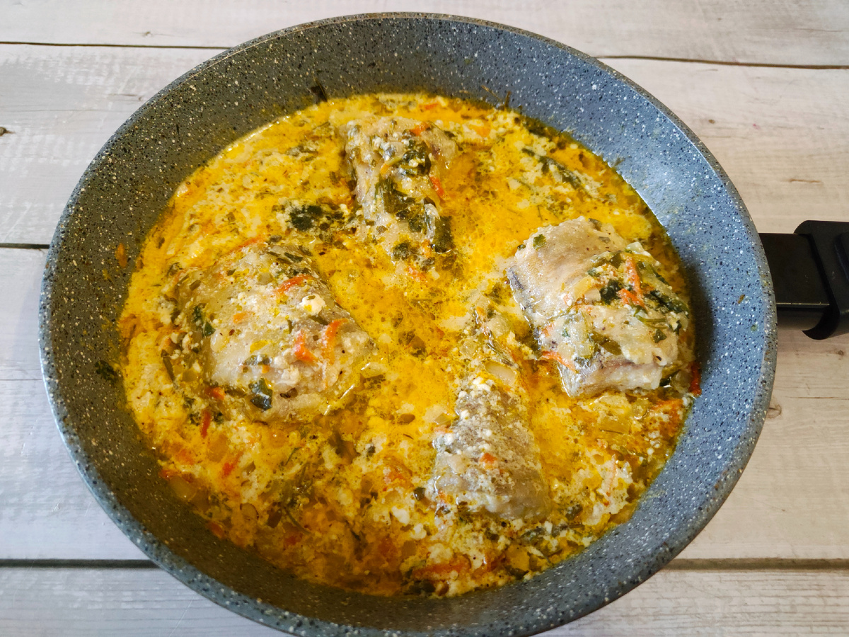 Когда на гарнир картофельное пюре или каша из любой крупы, часто хочется приготовить рыбу с вкусным соусом. Предлагаю простой вариант блюда на каждый день: - тушка минтая 2 шт. или 400 г филе - лук 1 шт. - морковь 1 шт. - сметана 1/2 стакана - вода 1/2 стакана - масло для жарки - приправа для рыбы 1 ч.ложка - соль, перец по вкусу - зелень (петрушка, укроп) Рыбу нужно тщательно обработать: отрезать плавники, выпотрошить, очистить от чешуи, удалить чёрные плёнки и, для удобства, разрезать на несколько частей. Натираем рыбу солью и перцем: На небольшом количестве растительного масла пассеруем лук и морковь, добавив приправу для рыбы. Огонь средний: У меня приправа с добавлением соли, так что соус больше не солю: Овощи не зажариваем - как только станут мягкими, выкладываем куски минтая, обваленные в муке: Обжариваем по 1 минуте с каждой стороны: В сметану добавляем воду, размешиваем и выливаем в сковороду. Посыпаем зеленью: Даём закипеть, уменьшаем огонь и накрываем крышкой. Гото