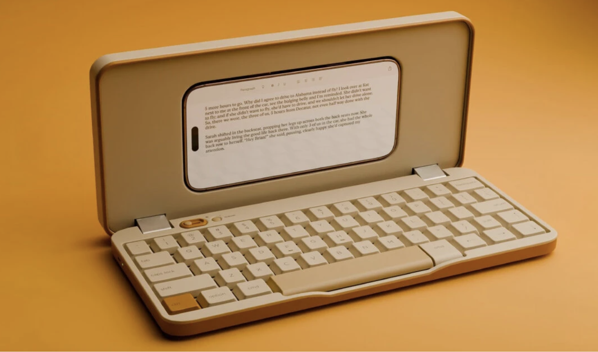 AmberDeck — это инновационный чехол, который превращает ваш iPhone в портативную пишущую машинку или карманный компьютер. Он оснащен компактной физической клавиатурой и предоставляет место для установки смартфона, используя его экран для отображения.