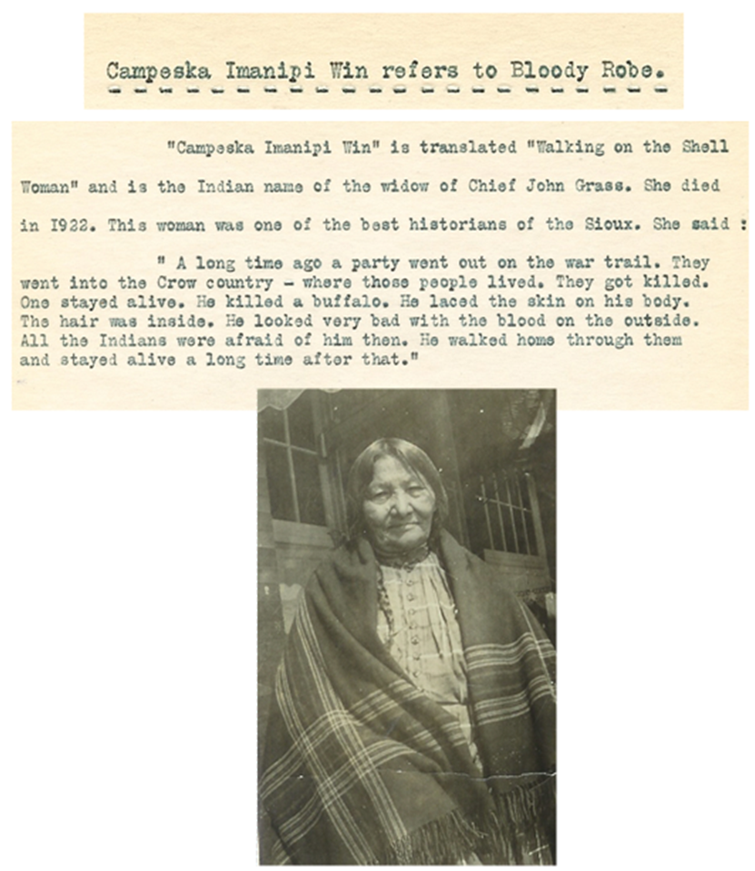 Кампеска Иманипи Вин, или Женщина, Ходящая по Скорлупе (что, возможно, означает необщительность, или осторожность в разговоре с кем-либо), жена вождя Джона Травы (Джон Грасс). Ее другое имя - Аманда Грасс. На фото запечатлен фрагмент ее рассказа о Кровавой Накидке. Она сообщила о военном отряде, который отправился в страну кроу. В результате почти все погибли, кроме одного человека. Он убил бизона, содрал с него шкуру и завернулся в нее почти с головой, оставив снаружи только волосы. У него был очень страшный вид, поскольку шкура была в крови. Враги боялись к нему подойти, видимо, из суеверного страха, поэтому он без проблем добрался до дома, и впоследствии прожил еще много лет.