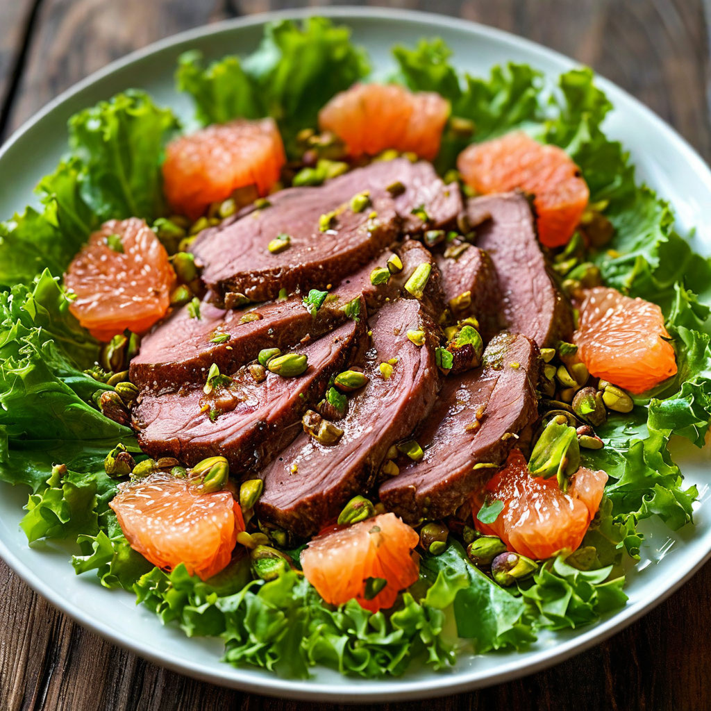 Вымойте листья салата, небрежно порвите их и выложите на порционную тарелку. На нее выкладывайте утку, предварительно порезав ее на крупные, но тонкие кусочки. Следом идет грейпфрут. Его необходимо очистить и добавить в салат в виде крупных кубиков. В качестве заправки используем оливковое масло, смешанное с апельсиновым соком в пропорции 1:1. Украшением салата и его пикантной изюминкой послужат фисташки, которые предварительно необходимо растолочь.