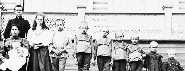 На этом снимке – сибирячка Мария Дмитриевна Корнильева, многодетная мама, как видите, весьма многодетная. Когда её муж Иван Менделеев тяжело заболел, забота о большой семье легла на женские плечи.