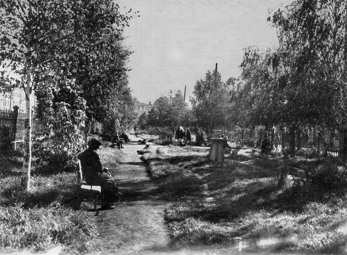 На снимке бульвар по современному проспекту Победы. Скорее всего это 1940-е годы. Важный момент. Сейчас бульвар находится немного левее, а в этом месте нынче газон. Вдалеке можно рассмотреть здание бывшей гостиницы «Эрмитаж» у Каменного моста, где сейчас размещается администрация города. Как видим, здание стоит по оси бульвара. На второй карточке показал красной линией, как раньше проходила ось бульвара. На снимке слева за забором была проезжая часть, а бульвар был разбит на месте стоянки ломовых извозчиков. Именно по этой причине он и размещался не по центру улицы, как сейчас. Как улица выглядела в начале 1930-х годов можно посмотреть на этом снимке. Там и коновязи для извозчиков, и проезжая часть и вторая бульварная дорожка, которая была ближе к Колхозному рынку.