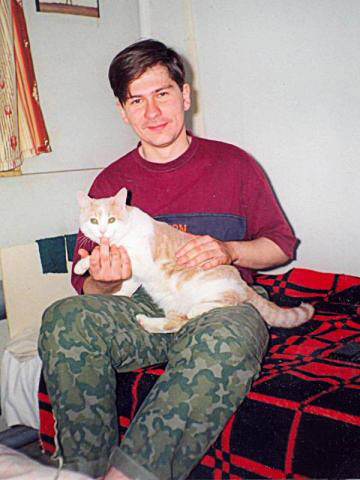 Сижу на кровати товарища, ибо фото предназначено для родителей, а над моей кроватью многими поколениями вахтовиков стена полностью оклеена вырезками из журналов специфического содержания. Над этой кроватью тоже есть, но выше и в кадр не попали (немного виден разворот журнала с Цоем в фильме "Игла"). Кот, вообще-то, жил в столовой, откликался на все имена и дружил, собственно, со всеми, но почему–то я ему особенно понравился и он иногда целенаправленно приходил из другого здания поспать на моей кровати.