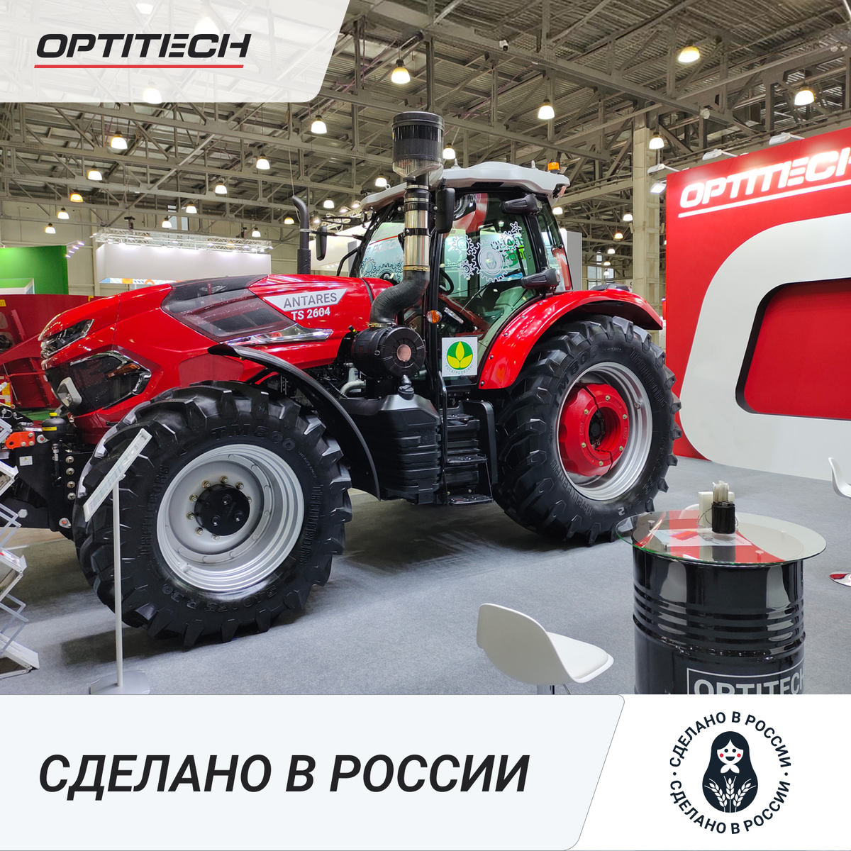 Самым крупным экспонатом на стенде ОПТИТЭК на АГРОС-2025 стал мощный трактор серии ANTARES TS 2604 с двигателем 260 л. с. Это самая энергонасыщенная сельскохозяйственная машина классической компоновки в товарном ассортименте компании, чей выпуск ведется на производственном комплексе компании в подмосковном Голицыно уже более года. Благодаря оптимальному сочетанию мощности и массы тракторы этой серии идеально подходят для тяжелых полевых работ с широкозахватными орудиями и агрегатами. Эффективному раскрытию тягового потенциала способствует надежная трансмиссия с 32 скоростями переднего и заднего хода. Благодаря системе электронного управления двигателем и топливной аппаратурой Common Rail тракторы ОПТИТЭК серии ANTARES крайне экономичны. Тракторы серии ANTARES TS 2604 оснащены гидросистемой с аксиально-поршневым насосом, способным обеспечивать подачу до 200 л/мин. Этого с большим запасом достаточно для любого посевного комплекса или другой сельскохозяйственной машины, требовательной к гидравлике, а значит, риск перегрева даже в экстремальных жарких условиях – минимален. Возможность комплектовать трактор передним навесным устройством и фронтальным валом отбора мощности позволяет агрегатировать с ним косилки типа «бабочка» шириной захвата 9 и более метров, обеспечивая высокую скорость и качество кормозаготовки.