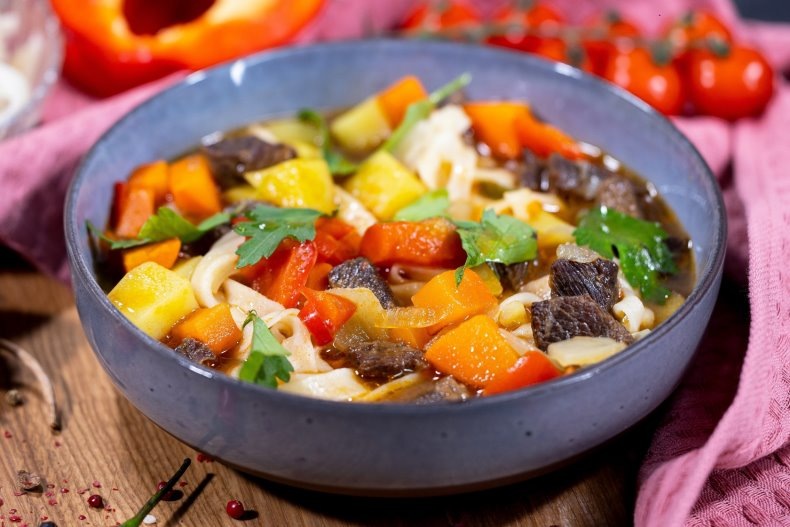 • Соль и черный перец – по вкусу 1. Муку, воду, соль соедините в миске и замесите однородное тесто. Оберните пищевой пленкой и уберите в холодильник на 2 часа. 2. Морковь, перец, лук, картофель нарежьте средним кубиком. 3. Перец чили и зубчики чеснока мелко нарубите. 4. Говядину нарежьте средним кубиком. Разогрейте кастрюлю с растительным маслом и обжарьте мясо до румяного цвета. 5. Добавьте к говядине лук и морковь. О