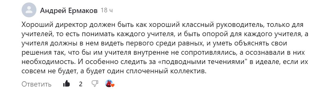 Недавно был пост на канале. Интересную тему подсказали читатели благодаря обратной связи. Если вы не успели прочитать, то вам сюда по ссылке- И как всегда у нас бывает комментарии- огонь)) Всем большое спасибо за мнения и интересные комментарии. Вот пишет Андрей Ермаков про хорошего директора. Да, хороший директор-это тот человек, который может повести за собой. Быть надёжной опорой, и за которым и в беде и в радости, и как за каменной стеной. Но в наше интересное время таких директоров остаётся всё меньше. Поскольку на них давят, и они требуют. Были не раз комментарии от самих завучей и директоров, и им тоже совсем не так уж и сладко на своих должностях. Читаем комментарий Андрея про директора- Но вот одна мысль зацепила в комментарии Андрея. Следить за подводными течениями в коллективе. Думаю, и в ученическом тоже. Конечно, прежде всего с классом работает классный руководитель. Но если он подаёт сигнал директору, то тот должен отреагировать? Да, должен. Рассказывает учитель нача