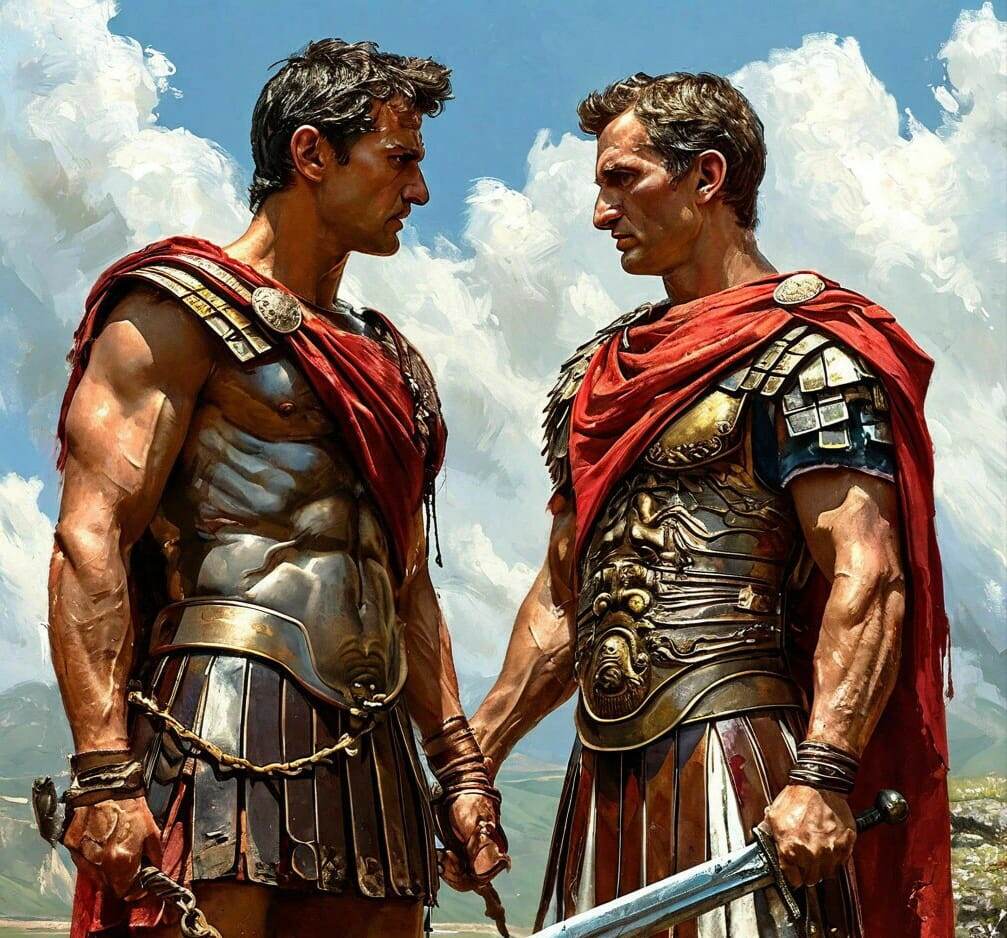 Противостояние Спартака и Гая Юлия Цезаря — один из самых драматичных эпизодов римской истории. Хотя Спартак не сталкивался с Цезарем в личном бою, их фигуры воплощают два полюса: восставшего гладиатора, символа свободы и отчаяния, и будущего диктатора Рима, гения стратегии и политики. Спартак, фракийский воин, попавший в рабство, в 73 году до н. э. поднял восстание в Капуе. Он возглавил беглых гладиаторов и рабов, создав мощную армию численностью до 120 000 человек. В течение двух лет его войско громило римские легионы, победив нескольких консулов. В этот период Гай Юлий Цезарь ещё не был великим полководцем. Он занимал пост квестора и не командовал армиями против Спартака. Однако некоторые источники предполагают, что он мог участвовать в сражениях в качестве офицера в армии Красса. Это остаётся дискуссионным, но несомненно, что опыт борьбы с восстанием повлиял на его последующую военную карьеру. В 71 году до н. э. римский полководец Марк Лициний Красс окружил армию Спартака в южной И