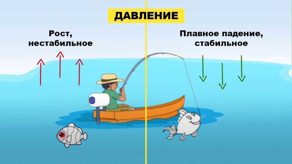 Колебание атмосферного давления нарушают жизненное равновесие рыб, поэтому клюет рыба лучше при длительно устойчивой любой погоде. Следует отметить, что при высоком давлении рыба поднимается к поверхности, при понижении давления рыба уходит в глубину. Но на самом деле давление на клев оказывает малое влияние будь то высокое или низкое, главное чтобы давление было устойчивое.