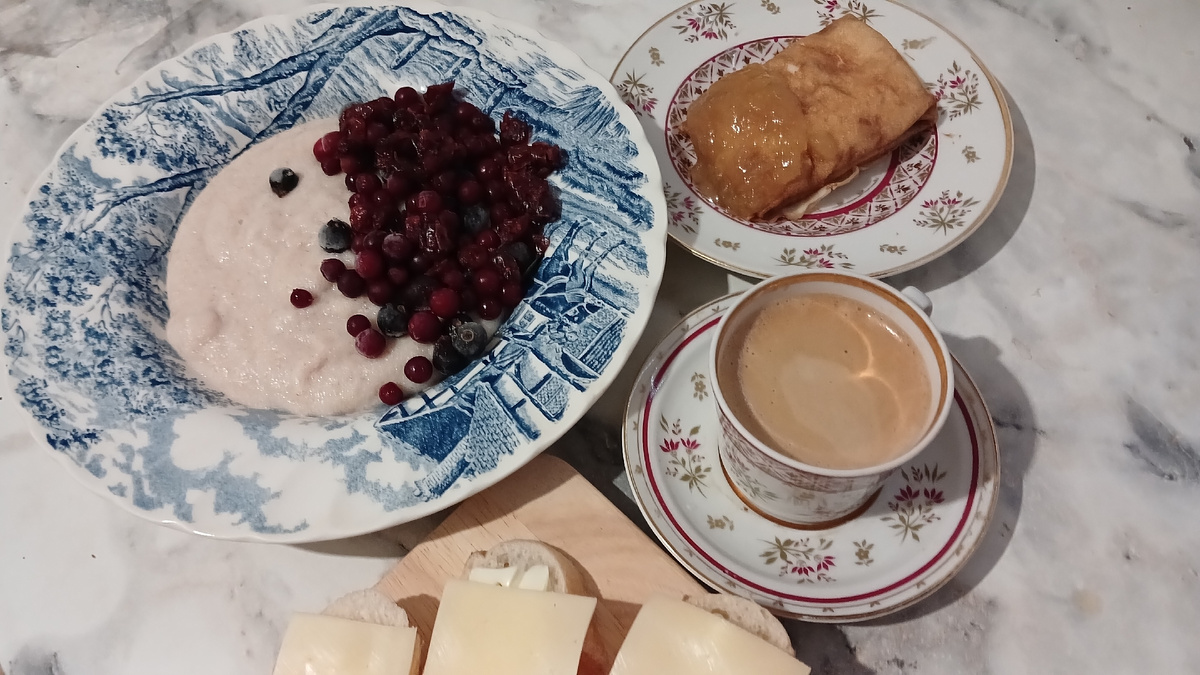 На этой неделе чистим морозилку и доедаем из нее сырники и блинчики. Сегодня на завтрак сварила манку из полбы, ягоды в тарелку добавила. К кофе - блинчик с творогом и изюмом, добавила ложку персикового джема к нему, и бутеброды с сыром. В кашу добавляла черную смородину и вяленую клюкву. На обед доели гороховый суп, сделала салат из свеклы с брынзой. Заправляла бальзамиком и оливковым маслом. На перекус мандарин, кофе и конфетка была А ужин поставила в духовку и освободила себе массу времени: запекала домашние свиные колбаски, картофель. Потом только нарезала салат - айсберг, огурцы и болгарский перец. Еще испекла торт Тирамису, не гонять же зря духовку только ради ужина. Но торт завтра на завтрак "откроем". Начнем экономить в феврале сразу с торта, чего мелочиться 😂 Меню год назад