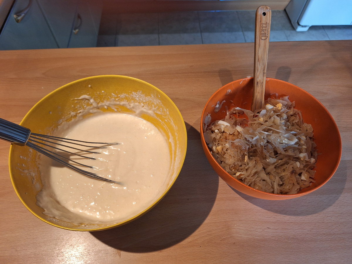 Яйцо С1 2 шт Соль 1 ч.л. Сахар 1 ч.л. Молоко 375 гр ( 1,5 стакана 250 гр) Масло сливочное 50 гр Мука 280 гр ( 2 стакана 250 гр) Разрыхлитель 2 ч.л. Приготовление: Взбить яйцо, соль и сахар до однородности. Влить молоко, растопленное масло. Положить муку и разрыхлитель. Перемешать до однородности. Тесто должно быть не очень густое. У меня начинка жареная капуста с яйцом. Может быть любая начинка. Фантазия не ограничена. Дать постоять 5 мин. Форма для выпечки 18х25 см. Форму смазать растительным маслом и вылить 1/2 теста. И поставить в духовку 200 гр на 7 мин. Вынуть, положить начинку и вылить остатки теста. Разровнять и в духовку на 35-40 мин. Выпекать до золотистого цвета. Остудить в форме 10 мин. Затем переложить на решётку и остудить окончательно. Ещё одна начинка. 1 варёная грудка курицы 1 средний лук 1 столовая ложка кетчупа Пожарить лук на растительном масле до готовности. Добавить мелко порезанную грудку и кетчуп. Пожарить ещё 1 мин. Очень вкусно получается. Приятного аппетит