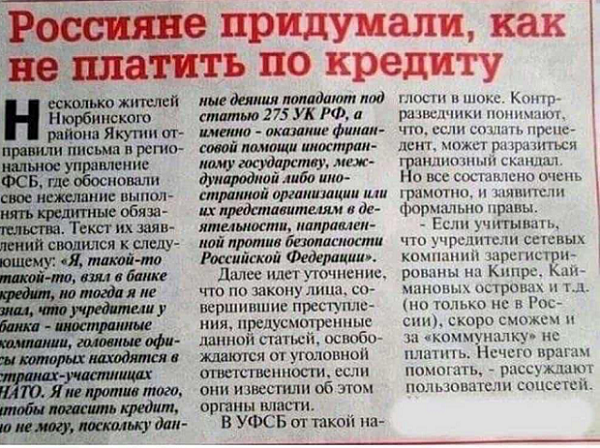 По соцсетям гуляет информация о том, что жители Якутии (странно, что не москвичи или питерцы, а именно якуты) придумали, как не платить по кредитам. Более того, отказавшись это делать, они направили коллективное письмо, и не куда-нибудь в администрацию Республики Саха, а в региональное управление ФСБ. В нем грамотным юридическим языком они обосновали свою позицию по этому вопросу, а именно, почему они отказываются платить по кредитам. Мы, имярек, когда брали кредит в банке, не знали, что его учредители являются иностранными агентами. Офис банка расположен в одной из натовских стран. Мы уже начали было гасить кредит, но вовремя остановились. Дело в том, что наши деньги в этом случае уйдут заграницу и мы можем попасть под статью 275 УК РФ за оказание финансовой помощи тем, кто выступает против безопасности России». В примечание к письму говорится, что по закону сообщивший об этом освобождается от уголовной ответственности. К сожалению, мы не знаем какой ответ на это письмо дали потомки ч