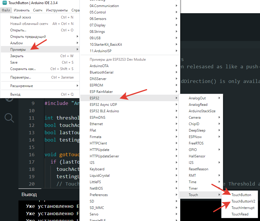 В среде Arduino IDE от разработчика можно найти 2 готовых примера, которые позволяют работать с сенсорным интерфейсом используя механизм прерываний, что позволяет не опрашивать сенсорные кнопки в основном цикле и не пропустить факт прикосновения к сенсорной площадке. У меня собран прототип на базе ESP32-S3 - поэтому расскажу что именно делает этот пример. Торчащая из ручки зеленого энкодера пластинка подключена к GPOI 7 Пример для работы с одной сенсорной кнопкой на GPOI 7 будет выглядеть следующим образом: При прикосновении в монитор порта выводится "Прикоснулись", если палец от сенсора убрать "Откоснулись" - полный аналог функций для обычной механической кнопки "Нажали"/"Отпустили" Как работает этот пример я думаю описывать не нужно. При прикосновении к кнопке вызывается процедура обработки прерываний: которая изменяет значение переменной touch1detected В основном цикле в любой удобный нам момент проверяем что она имеет значение true и вызываем функцию: bool touchInterruptGetLastStat