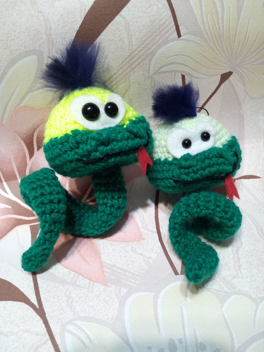 Меняем цвет. 10. 1 сбн , приб *15= 45 сбн 11. 15 сбн, (1 сбн, приб *4), 30 сбн=49 сбн 12. 15 сбн, (1 сбн, убав) *4,30 сбн=45 сбн 13 . 15 сбн, убав *3=42 сбн 14. 4 сбн , убав *7=35 сбн 15. 3 сбн , убав *7=28 сбн 16. 2 сбн , убав *7= 21 сбн Немного набить. 17. 1 сбн , убав *7=14 сбн 18. 7 убав=7 сбн Набираем до конца . Стянуть. Нить спрятать . Стяните . Оставьте нить для пришивания . Для того чтобы можно было закрутить хвостик в спираль вставьте проволоку. Оставьте нить для пришивания. Можно пойти более простым путём и вырезать из фетра. Пришить глазки нужно над полосой смены цвета. Вставьте безопасные глазки или приклейте полубусины . Чёрным цветом вышейте ротик. Язычок вырезать из красного фетра. Наша змейка готова. Приятного вязания !!!