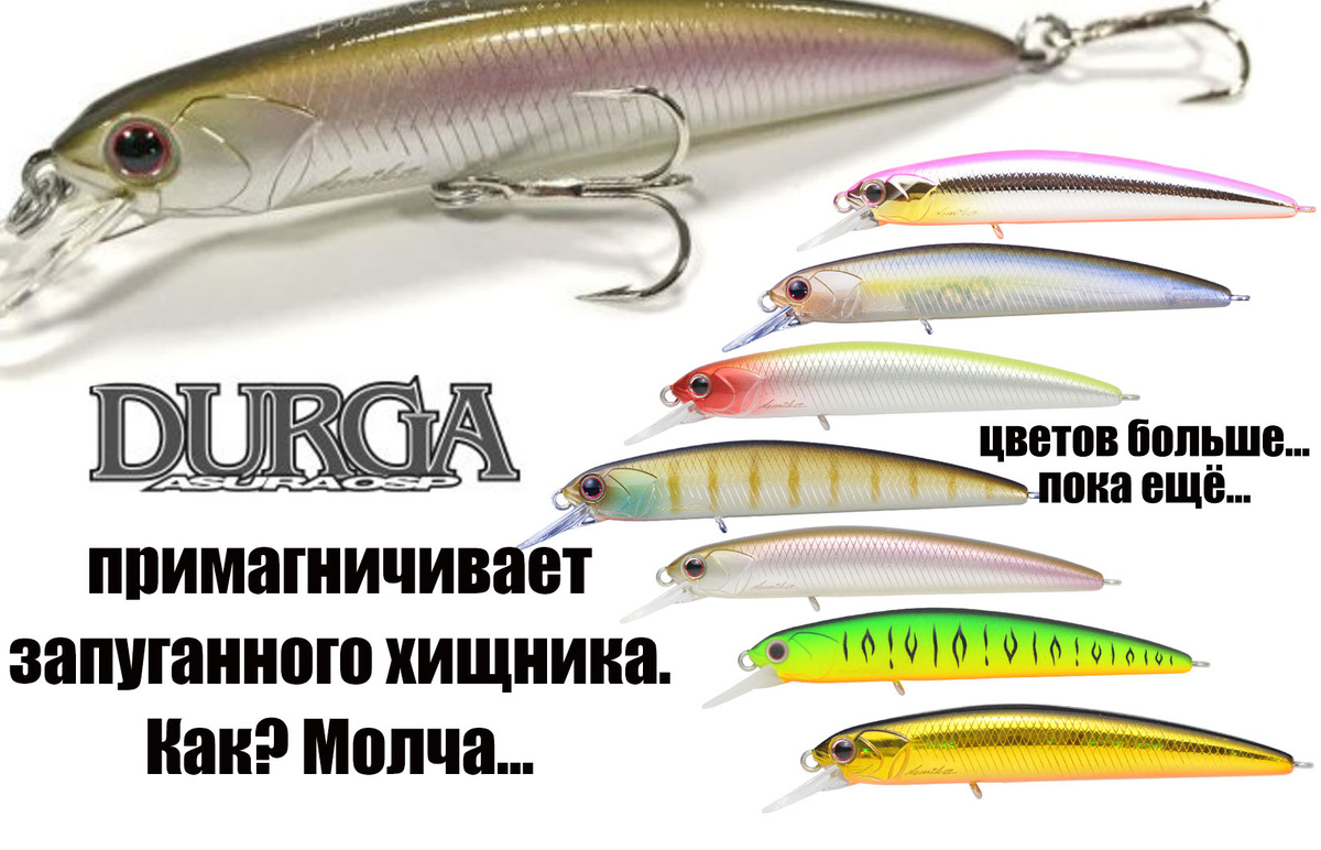 За этой небольшой минноу закрепилась репутация всесезонного воблера… отчасти потому что рыбы во все сезоны становится меньше… У Тошинари Намики были все основания ответить на вопрос, зачем он делает маленький воблер, когда вокруг все ударились в гигантизм вот так: «Рыбы становится всё меньше, и она всё пугливее и уходит всё дальше». Значит, задача добросить – и при этом не испугать! Именно поэтому в Дурге – первой среди минноу OSP – применена система дальнего заброса с магнитом. Во-первых, действительно, летит дальше – это важно для такой небольшой и лёгкой приманки. Во-вторых, магнит удерживает шары, у них нет возможности перемещаться во время проводки, они почти не шевелятся, и, следовательно, почти не создают шума, разве что шелестят… Тихо улетела, тихо приводнилась, тихо завибрировала на проводке высокочастотным роллингом. Твичинг – стихия Durga. Достаточно минимальных воздействий, чтобы это минноу зарыскала по сторонам, поблёскивая высокими боками. «Нешумная, но выразительная» – т