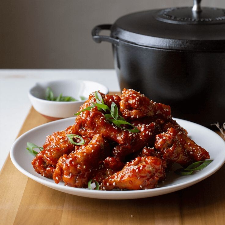 Ингредиенты: Для соуса: Способ приготовления: Промойте кусочки курицы в холодной воде (можно брать любые части или нарубить курицу). Добавьте молотый черный перец, соль, картофельный крахмал, муку, сладкую рисовую муку, пищевую соду и яйцо Тщательно перемешайте руками В глубокой сковороде, нагревайте масло в течение 7-8 минут. Погрузите кусочек курицы, если образуются пузырьки, можно жарить, температура масла правильная. Обжарьте курицу, используя метод двойной жарки. Обжарьте кусочки курицы 10 минут на высоких температурах. Выньте их из масла и встряхните. Обжарьте их снова еще 10 минут, пока все кусочки не станут выглядеть золотисто-коричневыми и хрустящими снаружи. Пока жарится курица, приготовьте соус. Положите масло и 4 зубчика чеснока в нагретую кастрюлю. Добавьте кетчуп, рисовый сироп, пюре из острого перца (там оно продается в магазинах и называется hot pepper paste), яблочный уксус. Тушите смесь около 7 минут. Затем тщательно перемешайте курицу с соусом. Корейская жареная