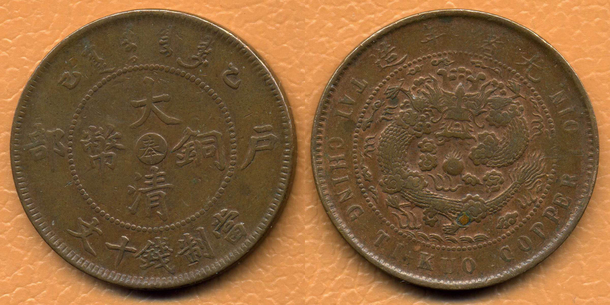 10 вэнь 1905 года, провинция Фэнтянь (Fèngtiān shěng 奉天省 / Abkai Imiyangga golo ᠠᠪᡴᠠᡳ ᡳᠮᡳᠶᠠᠩᡤᠠ ᡤᠣᠯᠣ), отчеканена в правление императора Дэ-цзуна Цзин-хуанди Цзайтяня (Dézōng Jǐng huángdì Zài Tián 德宗景皇帝載湉 / Dedzung Ambalinggū hūwangdi Dzai Tiyan ᡩᡝᡯᡠᠩ ᠠᠮᠪᠠᠯᡳᠩᡤᡡ ᡥᡡᠸᠠᠩᡩᡳ ᡯᠠᡳ ᡨᡳᠶᠠᠨ) на монетном дворе Главного управления изготовления серебряной монеты Фэнтяня (Fèngtiān zhìzào yínyuán zǒngjú 奉天制造銀元總局), управа Фэнтянь (Fèngtiān fǔ 奉天府).