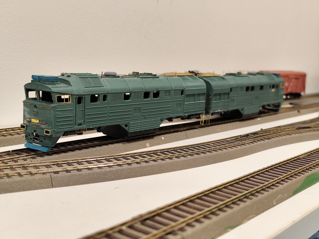 При окраске моделисту хотелось получить оригинальный цвет с двумя полосами по кузову. Между секциями локомотивами стоит жесткая сцепка от тепловоза 2М62 производства Roco. Колесные пары на ведущей секции выполнены без резиновых бандажей.