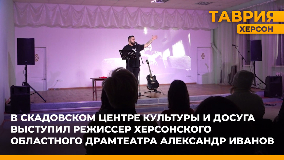 В рамках цикла вечеров литературной гостиной в Центре культуры и досуга города Скадовска состоялась «Встреча с артистом». Зрители смогли насладиться концертом молодого актера, певца, автора-исполнителя, сценариста и режиссера Александра Иванова. «Мне хочется верить, что это что-то космическое и необычное догоняет меня в порыве творчества, но чаще всего какие-то нехорошие события в жизни заставляют браться за перо», — поделился Александр Иванов. Концерт Александра Иванова совпал с двумя знаменательными датами — праздником студентов и Днём рождения Владимира Высоцкого, песни которого также были исполнены на сцене. Зрители получили незабываемые эмоции и заряд воодушевления. Херсонский драматический театр планирует продолжать организовывать подобные творческие вечера. Ранее ТРК «Таврия» сообщала, что в Геническе состоялся концерт, посвященный Всероссийскому Дню студента. Студенты Херсонского технического университета представили зрителям яркие творческие номера. ]]>