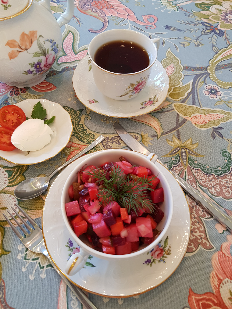 Добрый день, дорогие друзья! Сегодня я предлагаю вам рецепт лёгкого салата, который многими любим и знаком всем. Для приготовления нам понадобятся: свёкла 2 штуки, морковь 2 штуки, картофель 2 штуки, капуста маринованная 300 грамм, солёные огурцы 4 штуки, зелёный горошек консервированный 220 грамм, лук репчатый 1/2 головки, зелень петрушки и укропа, подсолнечное масло 50 грамм. Приготовление: маринованную капусту откидываем на сито, чтобы удалить маринад. Свеклу, морковь и картофель запекаем предварительно в духовом шкафу. Для запекания моркови, картофеля и свеклы завернуть их в фольгу и поместить в духовой шкаф на 50 минут при температуре 200 градусов Цельсия. Время приготовления зависит от размера овощей. Свекла готовится на 10 минут дольше, но если после выключения духового шкафа оставить овощи остывать в нем на несколько часов, то можно пренебречь разницей во времени. Остудить овощи и почистить. Нарезать картофель кубиком. Нарезать кубиком морковь. Нарезать кубиком свеклу. Наре