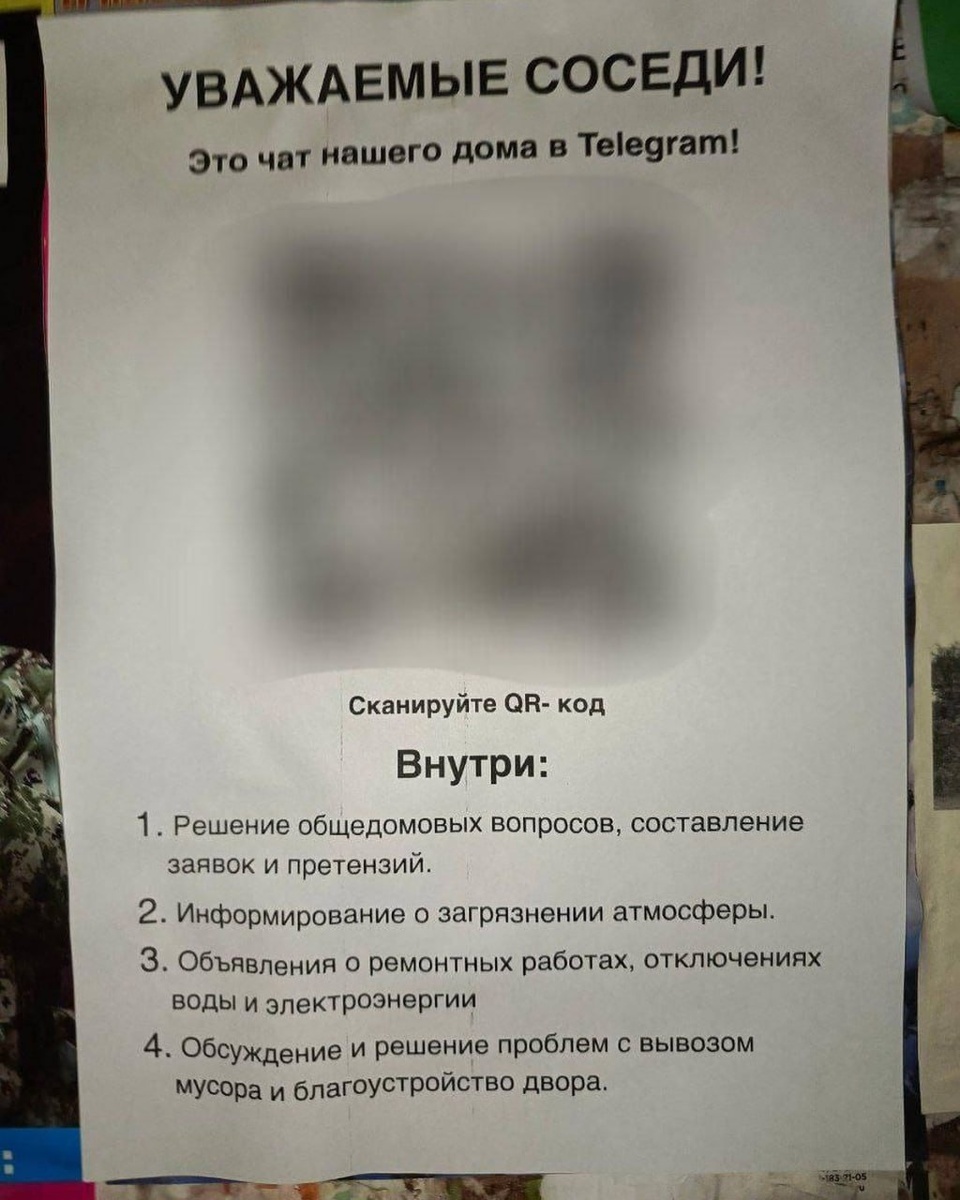 Мошенники начали взламывать Telegram-аккаунты россиян при помощи «домовых чатов». Один QR-код — и вы теряете ВСЕ свои данные. Схема такая: в подъезд вешают непримечательное объявление о новом чате для всех соседей. К нему прикреплён QR-код, по которому НЕЛЬЗЯ ПЕРЕХОДИТЬ. Предупредите старших.