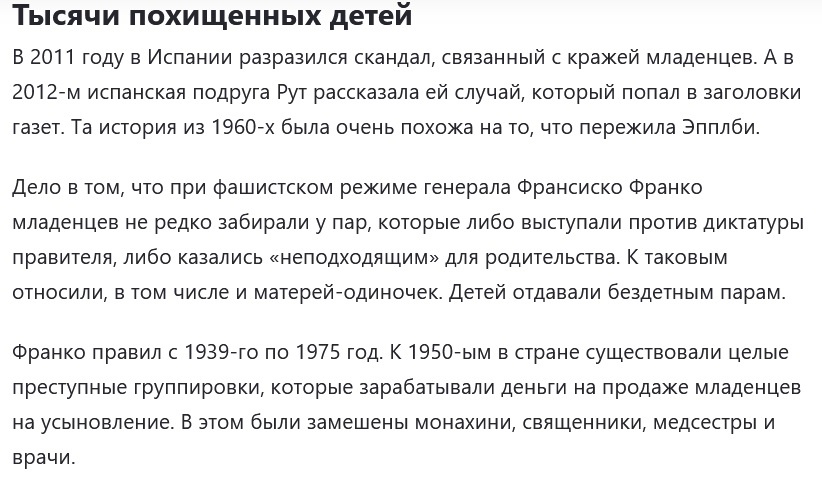 В 2011 году в Испании разразился скандал, связанный с кражей младенцев. А в 2012-м испанская подруга Рут рассказала ей случай, который попал в заголовки газет. Та история из 1960-х была очень похожа на то, что пережила Эпплби. Дело в том, что при фашистском режиме генерала Франсиско Франко младенцев не редко забирали у пар, которые либо выступали против диктатуры правителя, либо казались «неподходящим» для родительства. К таковым относили, в том числе и матерей-одиночек. Детей отдавали бездетным парам. Франко правил с 1939-го по 1975 год. К 1950-ым в стране существовали целые преступные группировки, которые зарабатывали деньги на продаже младенцев на усыновление. Смерть диктатора в 1975 году не стала поводом для приостановки этой деятельности. Детей забирали у родителей вплоть до 1990-х годов. Важную роль в раскрытии правды сыграло развитие науки и появление теста ДНК. Благодаря ему стало возможно собрать все необходимые доказательства. По оценкам, за все время существ