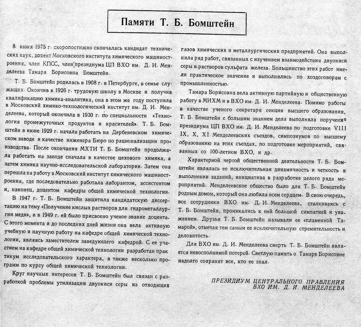 В 2025 году исполняется 50 лет со дня кончины Т. Б. Бомштейн. Может кто-то поделится своими воспоминаниями для материала о ней? Пока выкладываю некролог. Памяти Т. Б. Бомштейн 8 июня I975 г. скоропостижно скончалась кандидат технических наук, доцент Московского института химического машиностроения, член КПСС, член президиума ЦП ВХО им. Д. И. Менделеева Тамара Борисовна Бомштейн. Т.Б. Бомштейн родилась в 1908 г. в Петербурге, в семье служащих. Окончив в 1926 г. трудовую школу в Москве и получив квалификацию химика-аналитика, она в этом же году поступила в Московский химико-технологический институт им. Д. И. Менделеева, который окончила в 1930 г. по специальности «Технология промежуточных продуктов и красителей». Т. Б. Бомштейн в июне 1929 г. начала работать на Дербеневском химическом заводе в качестве инженера Бюро по рационализации производства. После окончания МХТИ Т. Б. Бомштейн продолжала работать на заводе сначала в качестве цехового химика, а затем химика научно-исследовательской
