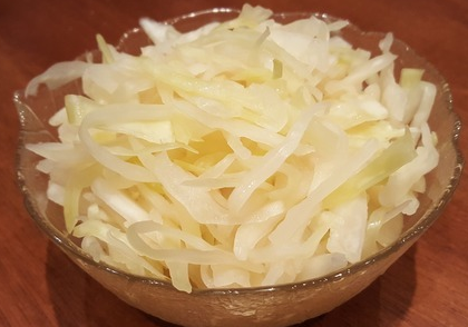 Ингредиенты: На 1 кг капусты - 1,25 стакана винного уксуса - 2,5 стакана воды - ½ стакана сахара - 10 горошин душистого перца - 1 лавровый лист - 1 ст. л. соли Приготовление: Выбрать небольшие здоровые, белые, плотные вилки капусты без зелёных листьев, удалить увядшие внешние листья. На каждом вилке, аккуратно соскоблив кочерыжку, сделать крестообразный надрез либо разрезать вилок пополам или на несколько частей и удалить кочерыжку. Подготовленную капусту мелко нарезать, смешать с солью (0,5 столовой ложки), немного размять руками до появления сока, поместить в банку, залить остывшим маринадом, накрыть банку пергаментом и оставить в тёмном прохладном месте. Для приготовления маринада: в чистую кастрюлю налить винный уксус, воду, добавить соль (0,5 столовой ложки), сахар, душистый перец, лавровый лист, довести до кипения, после чего остудить.