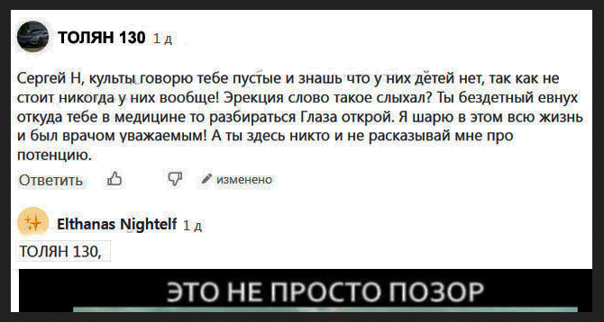 "Я знаю, что у культов всё повисло! Зачем писать про этот гнусный бодибилдинг? Там все нарциссы, которые в постели ничего не могут. Одни импотенты - ни детей, ни семьи. Дураки!" На днях на моём канале произошло воскрешение "Толяна" - пользователя, который был заблокирован за хамство и мат в адрес подписчиков канала, которые отстаивали железный спорт, своё увлечение и честь известных профессиональных атлетов. Заблокированный пользователь под ником "Толян 129" зарегистрировался на площадке "Дзен" заново, чтобы подписаться в очередной раз на "Железяки" и начать снова нести свет в мой тёмный канал про бодибилдинг, без устали спасая души "бесплодных качков". Не сильно углубляясь в своё огромное воображение, "Толян 129" превратился в "Толян 130", начав заново строчить комментарии под той же старой статьёй за декабрь, где он и был заблокирован ранее. "Отсутствие эрекции и полная импотенция абсолютно у всех качков" - это стало главной темой для воскресшего атлета Толяна, написавшего около 9 со