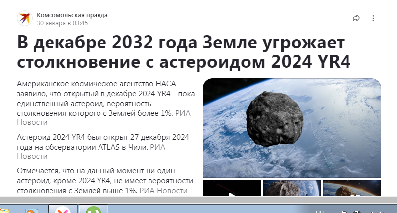 Всем привет! Вот это прям беда! Да еще и на пороге, считай, прям вот-вот! Ну а если по-серьезному? Граждане! Чего притихли? Астероид на Землю летит, а мы так и будем жаловаться на цены в Питерочке или Сфетоворе? Тогда уж давайте жаловаться на Метеопрогноз за то, что зимой неожиданно выпадает снег и бьют морозы... Астероид на Землю, это может быть что угодно. Может, это кара Господня всем нам. А вдруг он внезапно разделится на части, и они упадут в двух-трех местах, скажем, в Киеве, Вашингтоне и ... (тут на ваш выбор (в Жмеринке, в Воронеже на улице Васюкова, в общем, на ваш выбор)? Тогда ж это не наказание, а помощь Божия? И тогда ура? А что страшного на сегодня? Смотрим ленту новостей... А ничего! Ура!!! Нам ничего (кроме астероида, естественно...) сегодня не угрожает! Естественно, мы на астероид, по обычаю, забьем. Будем веселиться! И-эх, наливай! Блин, нечего наливать... Со вчерашней радостной новости про то, что айсберг громадный на Британию идет, ничего не осталось. И пенсия конч