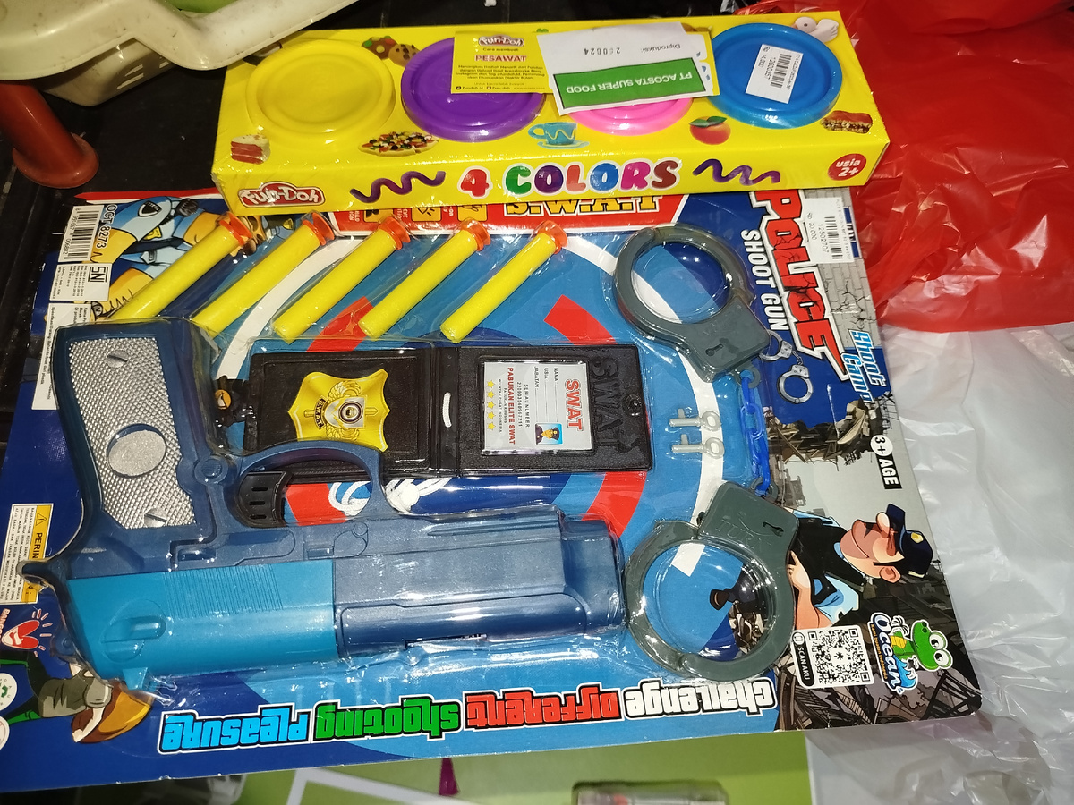 Пластилин - вещь нужная, но, как и любой другой расходный материал, довольно быстро заканчивающаяся. Поэтому вчера мы пошли за очередной порцией этого прекрасного изобретения. Но разве можно купить только то, зачем пришли? Амира хотела купить много чего ещё - набор косметики, ободок с зайчиком-другом Май Мелоди, присматривалась даже к крокодилу, который кусает, если нажать не на тот зуб. Это всë я взять не разрешила, но она увидела более полезную вещь, и купила в добавок к пластилину Пистолет хороший, я проверила. Наручники взрослым сильно малы. На значке написали имя, наручники полдня Амира носила с собой на поясе. Из пластилина я хотела сделать фишки для игры конги, сделала, даже получилось выиграть все раунды, но пластилин вообще не застывает, всë равно мнëтся и теряет форму, поэтому надо будет таки заказать их Игра хороша для развития мелкой моторики и концентрации внимания. Для моторики ещё полезно плетение из резиночек Я вчера впервые попробовала, до этого у меня никогда не был