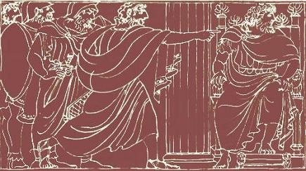 Слышен вдруг шум в глубине кулуара, Звуки борьбы, разнорЕчивый крик. Шум нарастал, словно пламень пожара... В зал Алкиноя вбежал вдруг мужик! Очи горели безудержной злостью, Голос гортанный срывался в фальцет. Все изумленно воззрились на гостя, То приснопамятный был Ээт!!! Папа Медеи и царь славных колхов, С ним еще дюжина верных бойцов. Рыскали долго по следу как волки, В Схерской земле нагнав беглецов. Дерзкие стал демонстрировать позы, Искры метал и топал ногой, Зубом скрипел и сыпал угрозы... Молча смотрел на него Алкиной. "Что же," - сказал рассудив очень мудро, "Тут не решить с кондачка мне, ей-ей! Давайте мы с вами дотерпим до у'тра, Ночи оно по-любому, мудрей!" С тем он в покои свои удалился, Властно отсрочив на ночь этот спор. Хоть Ээт как и прежде бесился, Всё же умерил и он свой напор... Продолжение следует...