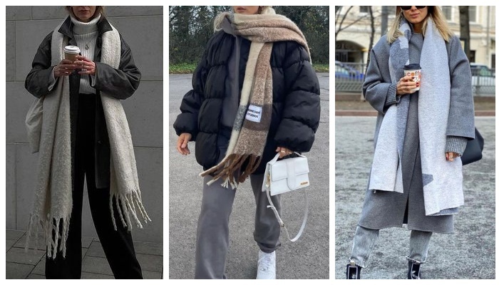 Модный аксессуар, который сегодня в тренде и сводит с ума всех модниц, — это длинный и объёмный шарф. С его помощью можно создать множество интересных зимних образов. В этой статье мы расскажем вам о нескольких вариантах таких ансамблей. Представьте себе стильный и практичный повседневный образ, который состоит из следующих элементов: Этот ансамбль будет радовать вас своим удобством и красотой каждый день. Актуальный многослойный зимний образ с трикотажным брючным костюмом стилисты завершили объемным шарфом с длинной бахромой сливочного оттенка. В результате получился теплый, уютный и практичный вариант образа на каждый день. Клетчатый шарф с бахромой + объемная куртка-пуховик + худи + спортивные оверсайз штаны + громоздкие белоснежные кроссовки + белый каркасный клатч — аутфит, который стоит повторить в этом сезоне каждой современной моднице. Яркие принтованные шарфы гуру моды зимой советуют комбинировать с однотонной верхней одеждой базового оттенка. Носите пестрые шарфы поверх верхн