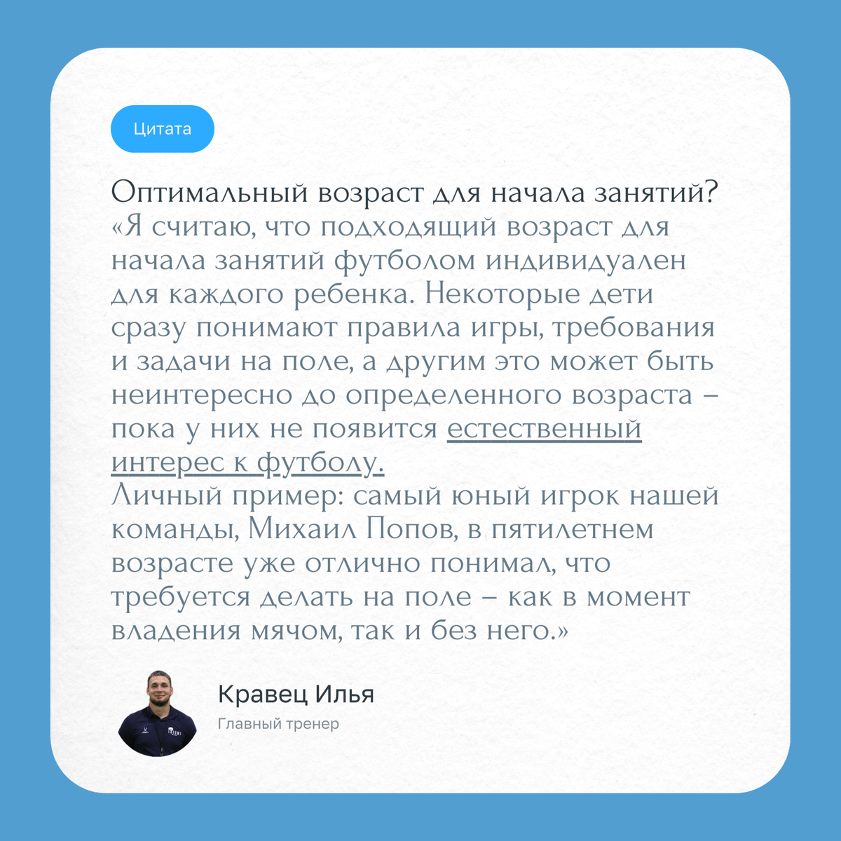 Футбол – один из самых популярных и доступных видов спорта. Многие родители хотят отдать ребенка в секцию, но не знают, в каком возрасте это лучше сделать и как поддерживать его интерес к тренировкам. В этой статье мы разберем эти вопросы, а также приведем мнение наших тренеров. С какого возраста можно начать заниматься футболом? Существуют разные подходы к началу футбольных занятий. Некоторые дети впервые выходят на поле уже в 3-4 года, другие – ближе к школьному возрасту. Важно учитывать физиологические особенности ребенка, его интерес к спорту и уровень физической подготовки. Что говорят наши тренеры? От 3 до 4 лет: знакомство с мячом Раньше трех лет отдавать ребенка в футбольную секцию не рекомендуется, так как малышу сложно понимать правила и выполнять упражнения. В этом возрасте занятия проходят в игровой форме: дети учатся взаимодействовать друг с другом, знакомятся с мячом, выполняют простые физические упражнения. Футбол для трехлетних полезен тем, что помогает выплеснуть энер
