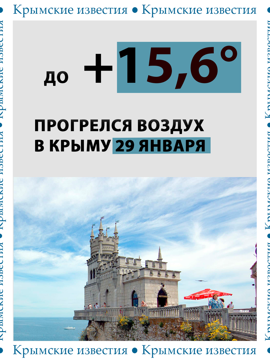 В Крыму побит температурный рекорд: 29 января воздух на полуострове прогрелся до небывалых для этой даты +15,6 градуса. Как сообщила «Крымским известиям» начальник Гидрометцентра РК Татьяна Любецкая, предыдущий температурный рекорд для 29 января был зафиксирован в Крыму в 1936 году и составил +15,4°С. Ожидается, что уже 30 января воздух в крымской столице может прогреться до +17 градусов. В этом случае будет побит температурный максимум 1900 году. Тогда в Симферополе столбики термометров показывали +16,4 градуса. Крымские известия. Больше новостей Вконтакте | Одноклассники | Telegram