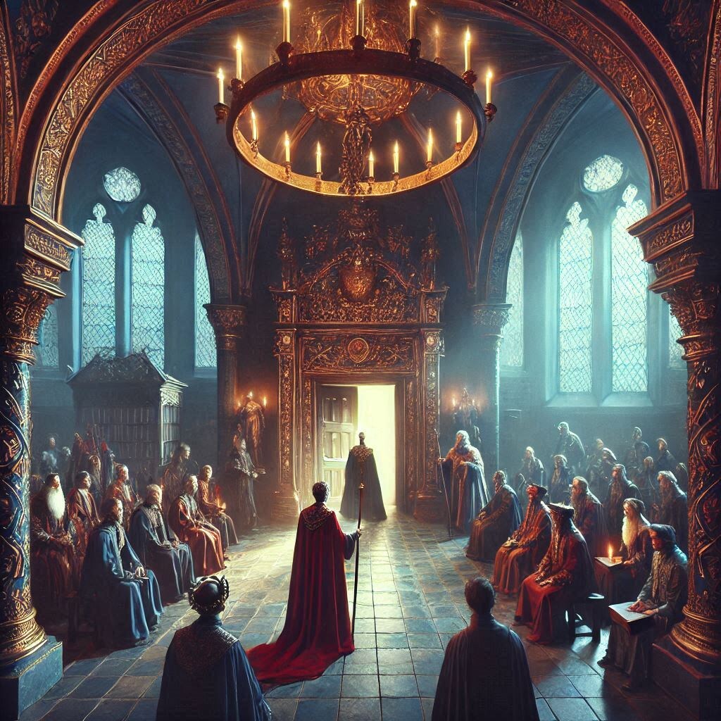 Не успела она до конца произнести фазу, как двери зала резко распахнулись. Твёрдой походкой в зал вошел высокий мужчина, с густой шапкой светлых волос, слегка тронутых сединой, и решительным взглядом зелёных глаз, он излучал одновременно благородство и властность. Его золотая мантия с эмблемой дома сверкала в лучах утреннего солнца.