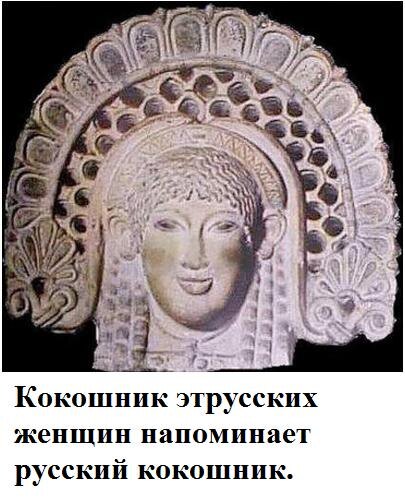 Примерно около 2000 г. до н.э. на малозаселённый славянами Апеннинский полуостров переселяются этруски. Историографы с целью сознательного искажения истории относят это событие к гораздо более позднему периоду (к 700-м годам до н.э.). В предыдущих главах говорилось, что есть признаки прихода прадревних греков на Балканы из Древнего Египта. Этруски пришли не из Египта, а из Передней Азии, которая в то время была полностью заселена племенами древнерусского происхождения. Эти племена называют "пелазгами", что является искажением и сокращением древнерусского "белый аз си". "Аз", это житель Азии, что в свою очередь является сокращением от "Расия". Русскую "с" восприняли, как латинскую "G", так и получилось искажение. То есть, это были "белые русские" или "белорусы". Этруски имели письменность, которая была вариантом развития исходного арийского рунического письма типа “черт и резов”. В предыдущих главах говорилось, что исходное, самое древнее руническое письмо было консанантного типа, без гласных и не предназначалось для записи пространных текстов. Этруски добавили в алфавит гласные звуки и могли записывать довольно длинные тексты. Этруски были в последствии уничтожены и ассимилированы древними римлянами. Сейчас стали доступны исследования геномов людей. Такие исследования населения исторической области Италии Тоскана показали, что они отличаются генетически от остального населения Италии. Предполагают, что это потомки этрусков, а название Тоскана, это искажённое Этрусканна. Далее провели генетический анализ породы коров, традиционно разводимой в этой местности. Оказалось, что генетически близкие к ним породы имеются только в Малой Азии на Анатолийском полуострове. Таким образом, этруски получили такое название потому, что были одним из древнерусских племён, населявших тогда Малую Азию (это название было аналогом более поздней Малороссии). Отсюда пошла некоторая общность в языке, письменности и культуре. Например, сохранились изображения этрусских женщин в кокошниках, сильно напоминающих традиционный головной убор русских женщин.