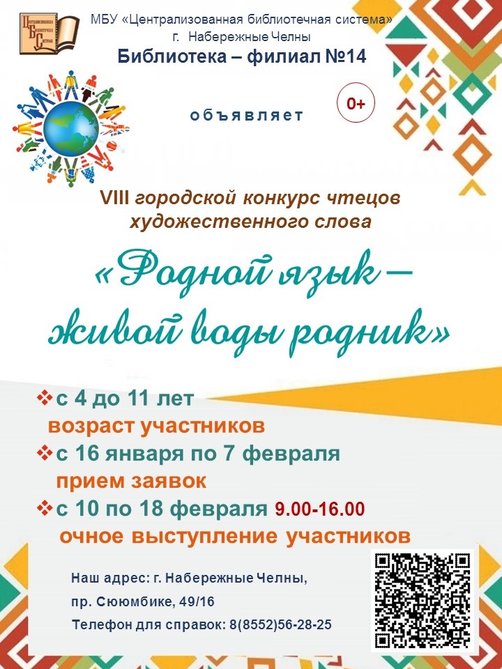 С 16 января по 7 февраля 2025 года МБУ «Централизованная библиотечная система» приглашает детей от 4 до 11 лет включительно принять участие в VIII городском конкурсе чтецов художественного слова «Родной язык – живой воды родник», посвященном Международному дню родного языка. Для участия в конкурсе необходимо подготовить выступление на русском или на татарском, или на других языках народов мира любой тематики и жанра (проза, поэзия).