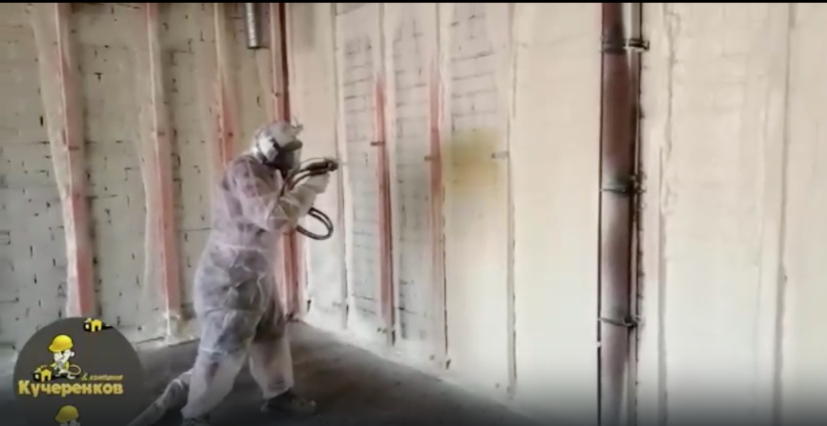 пенополиуратановой напыляемой теплоизоляции в сочетании с вентилируемыми фасадами на основе «Алюкобонд». Типов теплоизоляционных материалов довольно много, но условно их можно разделить на две неравные группы: материалы, которые требуют монтажа, и материалы, которые напыляются на поверхность подобно автомобильной краске. Ко второй группе на сегодняшний день можно отнести различные виды напыляемой теплоизоляции на основе полиуретанов. Первую группу, в свою очередь, можно разделить на твёрдые материалы и мягкие материалы. Плюсом мягких материалов является то, что при их укладке проще избежать щелей и, как следствие, мостиков холода; недостатком — необходимость использования ветрозащиты и пароизоляционного слоя. Плюсом жёстких материалов является, то, что для них нет необходимости устанавливать ветрозащиту, недостатком — сложность отделки неровной поверхности; кроме того, большинство подобных материалов горючи. Пенополиуретан принципиально отличается от всех материалов первой группы. Его