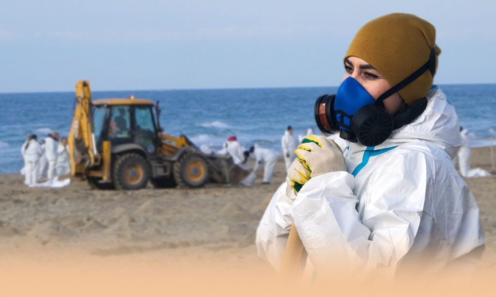 С чем ассоциируется обычно море? С приятным бризом, ласковыми волнами, отпускниками в легкой одежде... Но никак не с запахом мазута, черными маслянистыми пятнами на песке и с людьми, одетыми в белые костюмы и слаженно выполняющими одну и ту же работу.