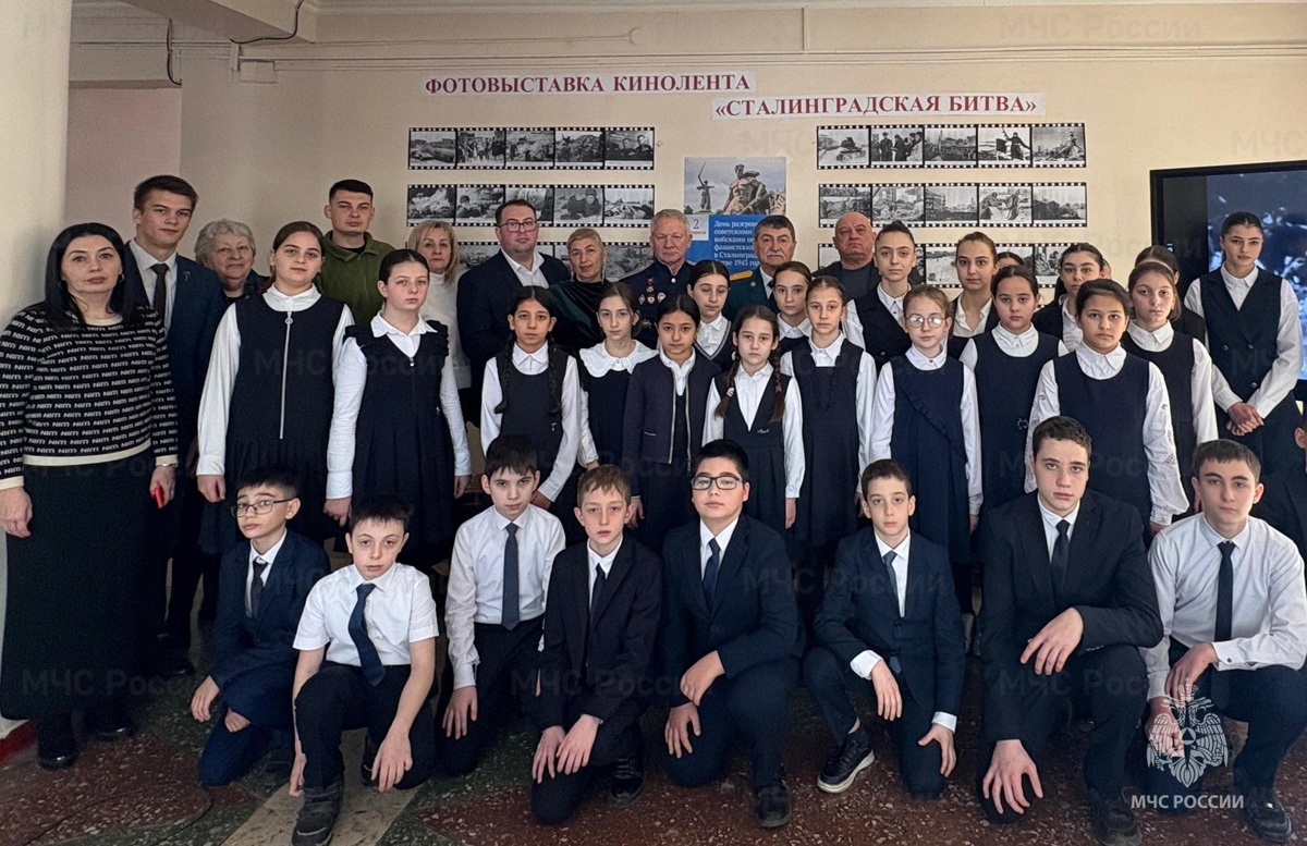 Накануне во владикавказской школе № 42 имени Х. Мамсурова прошло значимое мероприятие, посвященное годовщине Победы в Сталинградской битве и открытию фотовыставки кинолетописи «Сталинградская битва». В нем принял участие почетный гость – председатель Совета ветеранов Главного управления МЧС России по Республике Северная Осетия-Алания Виктор Чегаев.