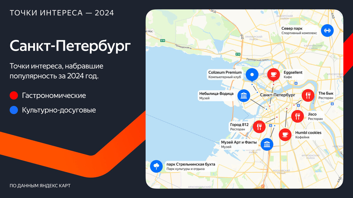 Аналитики сервиса «Яндекс Карты» рассказали, какие места в Петербурге стали самыми интересными для жителей в 2024 году. Среди гастрономических точек интереса Петербурга – первый в городе ресторан «The Бык», расположившийся на Невском проспекте, американское кафе Humbl cookies, ресторан «Город 812», корейское кафе Jisco в ТРЦ «Галерея» и первое полноформатное кафе московской сети Eggselent, появившееся на набережной реки Мойки. «Пятерку» культурно-досуговых мест возглавил детский музей-аттракцион «Небылица-Водица», открывшийся на первом этаже доходного дома Серебряковой на улице Декабристов. В этом же списке – музей «Арт и Факты», находящийся в пространстве Vokzal 1853, парк «Стрельнинская бухта» на берегу Финского залива, киберспортивный клуб Colizeum Premium на Васильевском острове и мультиспортивная арена «Север парк». Ранее «Яндекс Путешествия» создали копилку мест для будущих поездок.