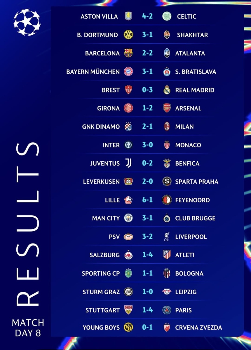Борьба за выход в 1/8 финала между "Астон Виллой" и "Селтиком" завершилась в пользу первых. Хет-трик Моргана Роджерса приносит победу бирмингемцам в британском дерби. Также Морган Роджерс стал автором самого раннего дубля в истории Лиги чемпионов, забив дважды уже через 4 мин 5 сек после стартового свистка. Самый яркий "привоз" был в матче "Боруссии" Д и "Шахтера" со стороны Грегора Кобеля. Шмели остались в одном шаге от прямого выхода дальше. «Барселона» и «Аталанта» результативно поделили очки. Обе команды идут дальше. Сине-гранатовые не пользуются осечкой «Ливерпуля» и остаются на втором месте таблицы. Мюнхенцам необходимо было забивать 8 мячей и ждать результатов параллельных матчей для выхода в 1/8. Гол "Слована" лишает клуб дополнительных €250k (такую сумму платят за подъем на одну позицию в таблице) и опускает "Баварию" на 12 строчку. "Бавария" идет дальше, а "Слован" давно лишился шансов на борьбу за плей-офф. Мадридский "Реал" на классе громит "Брест", обе команды в 1/16 фина